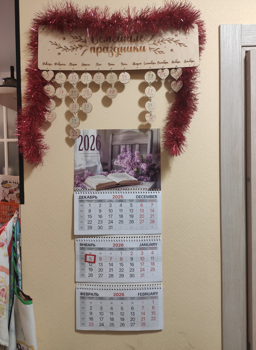 Поэтому купила на ВБ календарь-напоминалку. Она очень удачно вписалась между кухней и ванной, эдакий полезный
