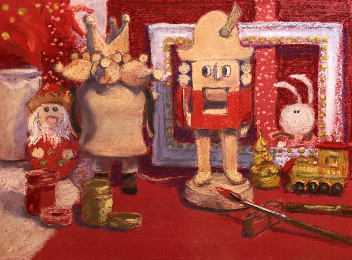 В частности - надо ли пояснять, что хотел сказать автор и в какой момент это делать. Художники делятся на следующие группы: надо до созерцания, надо после, не надо (аргумент "если надо пояснять, то пояснять не надо"))) Я любитель - "после". Сначала свое впечатление, потом чтение описания, возможность перевернуть восприятие. Иногда это "после" мешает, а иногда усиливает удовольствие от знакомства с творческой работой. Итак, сюжет моего "Щелкунчика" Мастер начал роспись деревянных заготовок и отлучился, оставив краски и кисти. Тут же, как-только он отошел, сказка начала оживать - Щелкунчик увидел Мышиного короля, с которым ему придется сразиться в Рождественскую ночь. Когда мастер вернётся фигурки снова замрут и будут мирно сосуществовать, дожидаясь Рождества, чтобы сыграть свои сказочные роли. За развитием истории наблюдают подаренный подругой мастера вязанный заяц и гномик (никто не помнит как он появился, но он тоже стал ежегодным участником Рождественской истории). Эта работа посв