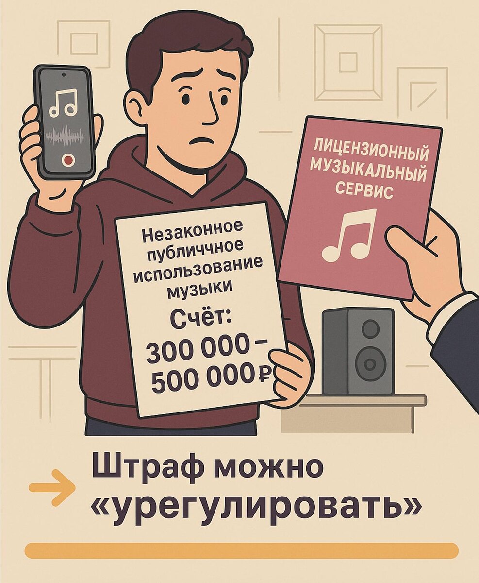 Как вас могут наказать за трек, который официант включил “для настроения”. 🕵️ Что вообще происходит? По заведениям ходят «музыкальные ревизоры». В руках — телефон, на лице — невинное выражение. Он делает пару секунд записи с популярным треком у вас в зале… и исчезает. Через неделю прилетает письмо: «Незаконное публичное использование музыки. Счёт: 300 000 — 500 000 ₽». А потом, как по нотам, появляется компания, которая: Классика жанра: продажи через страх. 🔥 Почему так происходит? Потому что большинство заведений играют музыку из: Это всё нельзя использовать публично. Для юриста это то же самое, что показывать пиратский фильм в кинотеатре. 🛡 Как НЕ стать жертвой музыкального рэкета 1) Забудьте про “телефон официанта на колонке” Все стриминговые сервисы дают право слушать музыку лично, а не транслировать в бизнесе. 2) Оформите легальную публичную лицензию Есть два пути: 3) Держите документы в заведении Контракт + квитанции = ваш бронежилет при проверке. 4) Не используйте “серые плей