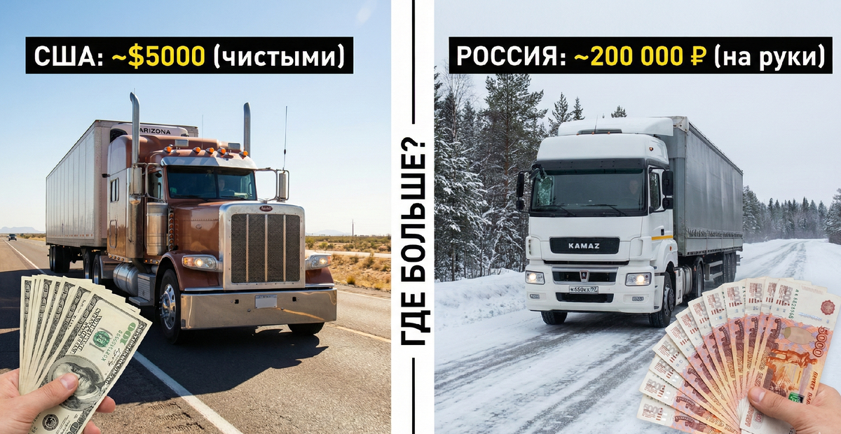 Профессия дальнобойщика окружена романтикой только в сериалах. В жизни это тяжелый труд, спина, которая «отваливается» к вечеру, и вечный поиск нормального душа. Но почему тогда тысячи мужчин (и даже женщин!) ежегодно штурмуют автошколы, чтобы открыть категорию Е? Ответ прост: деньги. В интернете гуляют легенды о баснословных заработках водителей в Америке и о том, как «поднялись» ставки в России. Давайте отбросим эмоции, возьмем калькулятор и сравним, где трава зеленее, а кошелек толще. Начнем с США. YouTube завален роликами, где блогеры показывают чеки с суммами в $8 000 или даже $10 000 в месяц. Переводим в рубли по текущему курсу — получается почти миллион! Кажется, нужно срочно бросать всё и лететь за океан. Но дьявол, как всегда, кроется в деталях. В Штатах зарплата дальнобойщика обычно считается в центах за милю. Чем больше проехал, тем больше получил. Новичок стартует с 50–60 центов за милю. Чтобы заработать те самые «красивые» 8 тысяч долларов, нужно буквально жить за рулем, н