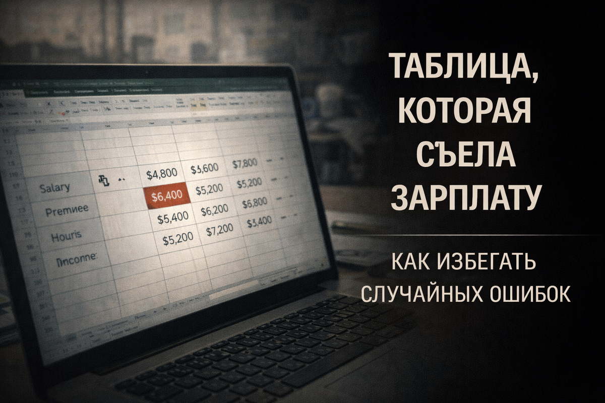 Таблица, которая съела зарплату. Реальная история о том, как одна ошибка в Excel привела к потере зарплаты и почему такие вещи происходят снова и снова. PDF «Как избегать случайных ошибок» В КОНЦЕ МЕСЯЦА ЧТО-ТО НЕ СОШЛОСЬ. Не катастрофа. Не «всё пропало». Просто цифра была меньше. — «Наверное, в следующем месяце поправят». Не поправили. КОГДА ОШИБКА СТАНОВИТСЯ ДЕНЬГАМИ. Таблица считала: Она не ругалась. Не показывала ошибок. Она просто считала не так. ПОЧЕМУ ЭТО САМОЕ СТРАШНОЕ. Потому что: Excel не ворует деньги. Он просто молчит, когда его не проверяют. КАК ТАКОЕ ПРОИСХОДИТ. Чаще всего из-за: Каждая по отдельности — мелочь. Вместе — потеря денег. САМЫЙ ОПАСНЫЙ МОМЕНТ. Когда ты видишь цифру и веришь ей сразу. Без: ПОЧЕМУ ВИНОВАТЫХ НЕ НАХОДЯТ. Потому что: В итоге: