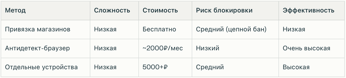 Таблица сравнения методов создания мультиаккаунтов