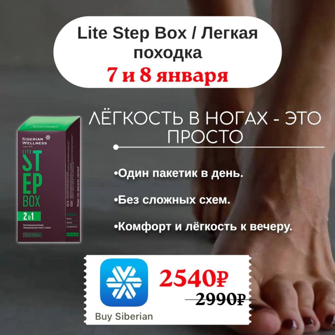 : ✅уменьшается тяжесть и усталость в ногах ✅отёки становятся меньше, к вечеру ноги легче ✅ощущение лёгкости при ходьбе и движении ✅поддержка тонуса сосудов и кровообращения ✅комфорт и энергия в течение всего дня Всего 1 пакетик в день - удобно и просто. Ноги благодарят вас мягкой поддержкой без сложных схем и процедур. Lite Step Box / Легкая походка https://ru.siberianhealth.com/ru/shop/catalog/product/500467/?referral=6126636 🌪️Эти комплексы разбирают очень быстро. Скидка приятная, а результат рабочий - именно поэтому их так ценят. ✉️Пишите мне для заказа👌🏻