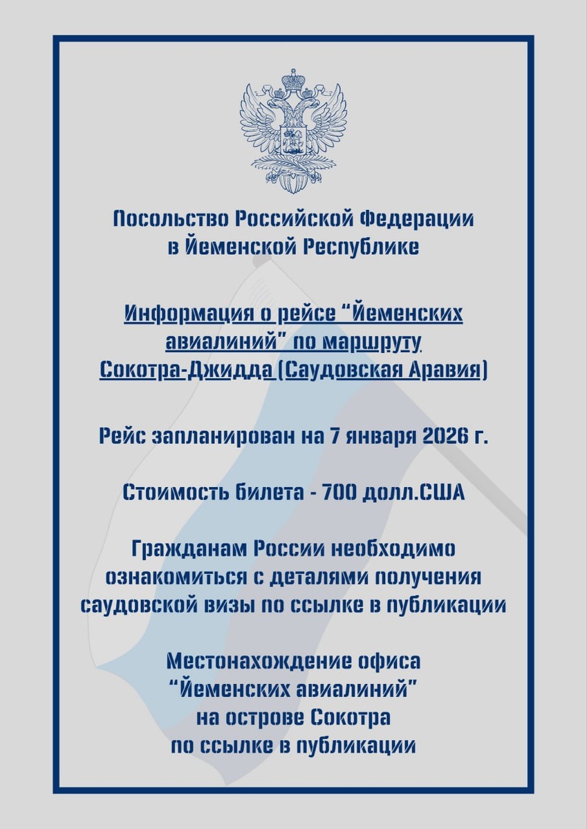 Российские туристы, застрявшие на йеменском острове Сокотра, могут вернуться домой через Саудовскую Аравию. Как рассказали в Посольстве РФ в Йемене, авиакомпания Yemenia Airways 7 января запустит коммерческий рейс с острова в Джидду. Возможно, позднее будет введено регулярное сообщение, но точной информации на этот счет пока нет. В посольстве уточнили, что стоимость билета - 700 долларов, его можно приобрести в офисе компании на Сокотре. «Просим внимательно ознакомиться с порядком получения визы в Саудовскую Аравию (ее можно оформить по прибытии. – Ред.) и учитывать тот факт, что в Джидде вам с высокой долей вероятности будет необходимо сменить терминал для дальнейшего возвращения домой», - добавили дипломаты. Ранее агентство ТАСС сообщало, что на Сокотре из-за отмен рейсов находится более 400 иностранных туристов, среди них - около 60 россиян. @tourdom