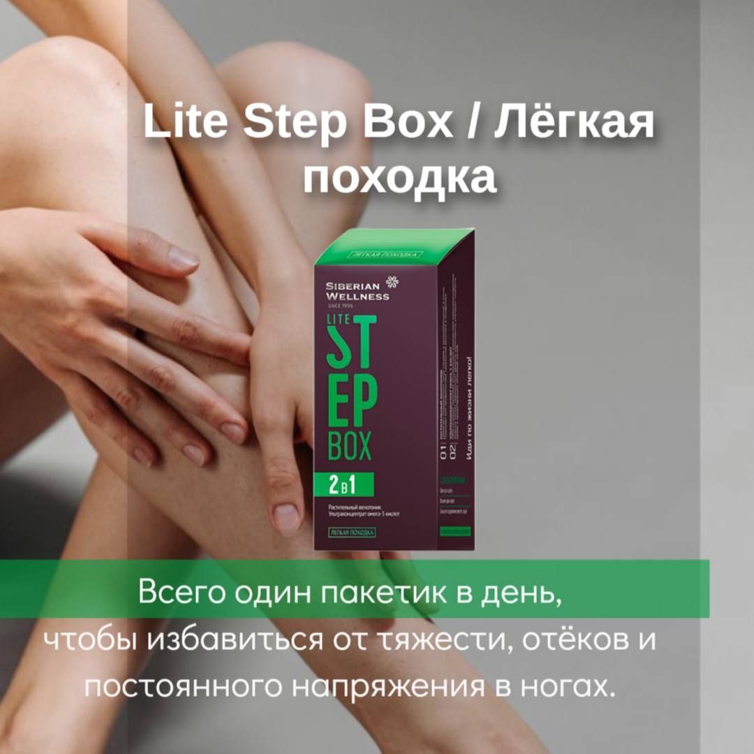 Если ноги устают ещё до конца дня, появляется тяжесть, отёки или гул - это сигнал, что им нужна поддержка. Лёгкость в ногах может стать редкостью без правильной заботы. Lite Step Box / Лёгкая походка Это удобный ежедневный комплекс, который помогает снять напряжение и вернуть ощущение лёгкости. Всего 1 пакетик в день - утром или в удобное время, и ноги благодарят вас уже через несколько дней.