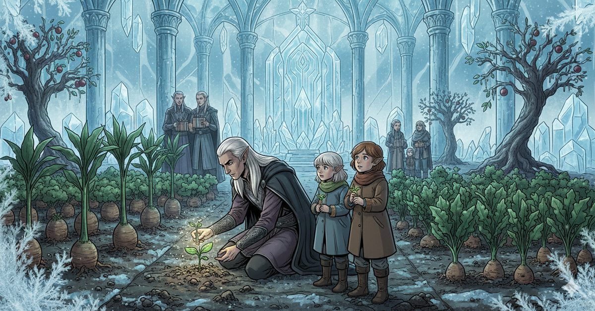 В мире вечной зимы вопрос еды никогда не был простым. Не потому, что её не хватало — нет, голод здесь считался признаком плохого управления и вызывал немедленное вмешательство. Сложность заключалась в другом: растения, как известно, имеют наглость расти там, где им тепло, а тепло в этих краях воспринималось скорее как тревожный симптом, чем как ресурс. Поэтому к земледелию здесь подходили вдумчиво, осторожно и с уважением к холоду. Почву не грели. Это считалось варварством. Землю готовили иначе: слой за слоем, уплотняя, выравнивая, насыщая минералами и магическими стабилизаторами. Хорошая грядка должна была быть холодной, плотной и устойчивой — почти как характер приличного эльфа. Основу рациона составляли корнеплоды. Они не спорили с зимой, не пытались тянуться к солнцу и прекрасно чувствовали себя в темноте и прохладе. Репа, клубневые культуры, подземные плоды — всё, что росло вниз, ценилось выше всего остального. Считалось, что растение, выбравшее глубину, уже сделало правильный ж