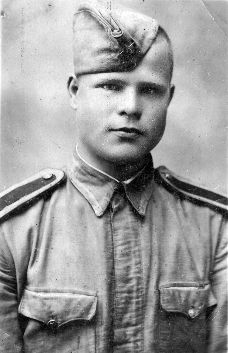 Курсант пехотного училища в гимнастерке с отложным воротником со следам от недавно споротых петлиц.