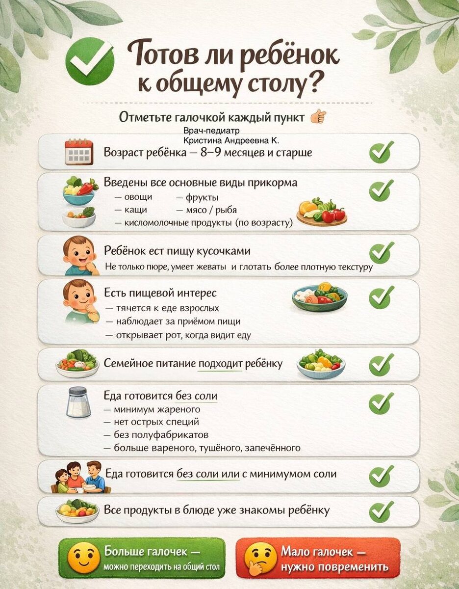 ? 🟣🟣🟣🟣🟣🟣🟣🟣🟣 🟤Переход на общий стол — это момент, когда ребёнок начинает есть ту же пищу, что и остальные члены семьи (с учётом адаптации под детский возраст). 💬Когда можно говорить о готовности к общему столу? 🟣Ребёнку больше 8–9 месяцев 🟢Введены все основные виды прикорма ⚪️Ребёнок умеет жевать и ест пищу кусочками ➕Есть пищевой интерес: тянется к еде, наблюдает за взрослыми ↪️Рассмотрим две ситуации из жизни: 1️⃣Мама устала готовить отдельно Ребёнку исполнился год, мама хочет перевести его на общий стол. Но питание семьи в основном состоит из: — жареной пищи — жирных сортов мяса — полуфабрикатов, колбас, соусов ❌В этом случае переход на общий стол — не лучшее решение для детского организма. ЖКТ ребёнка ещё не готов к такой нагрузке, даже если возраст уже позволяет. 2️⃣Семейное питание близко к детскому Малыш ест кусочками, проявляет интерес к еде родителей. Мама готовит: — супы — тушёные и варёные овощи — каши — нежирное мясо и рыбу Единственный вопрос — соль. ✅В этом
