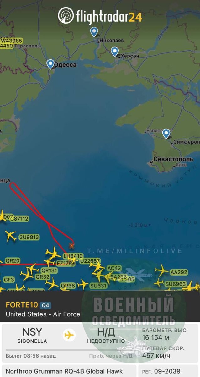 Сегодняшняя рутинная работа стратегического разведчика ВВС США RQ-4B Global Hawk (позывной - FORTE 10), уважаемых американских партнеров в нейтральных водах Черного моря в районе Крыма. Военный Осведомитель