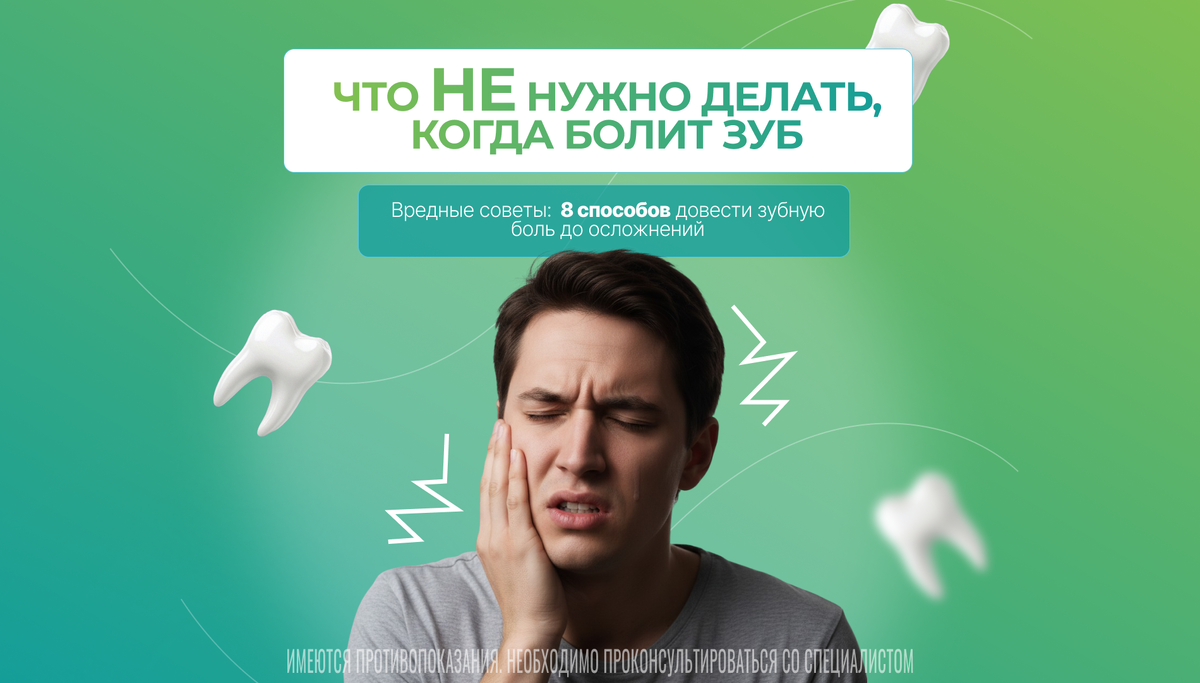 Когда болит зуб, важно понимать не только что нужно делать, но и что НЕ нужно. Ошибки при самопомощи часто приводят к осложнениям, потере зуба и серьезным воспалениям. Как этого избежать — читайте в нашей статье. Причины зубной боли всегда связаны с поражением тканей. Самые частые причины: Помните, что боль — это симптом, а не диагноз. Вы можете снять его самостоятельно, но устранит проблему только стоматолог, и лучше не затягивать с походом к нему. Если появилась острая боль, ни в коем случае не делайте следующее: Грелки, горячие компрессы, чай. Почему нельзя: тепло усиливает кровоток и отек, инфекция распространяется быстрее.