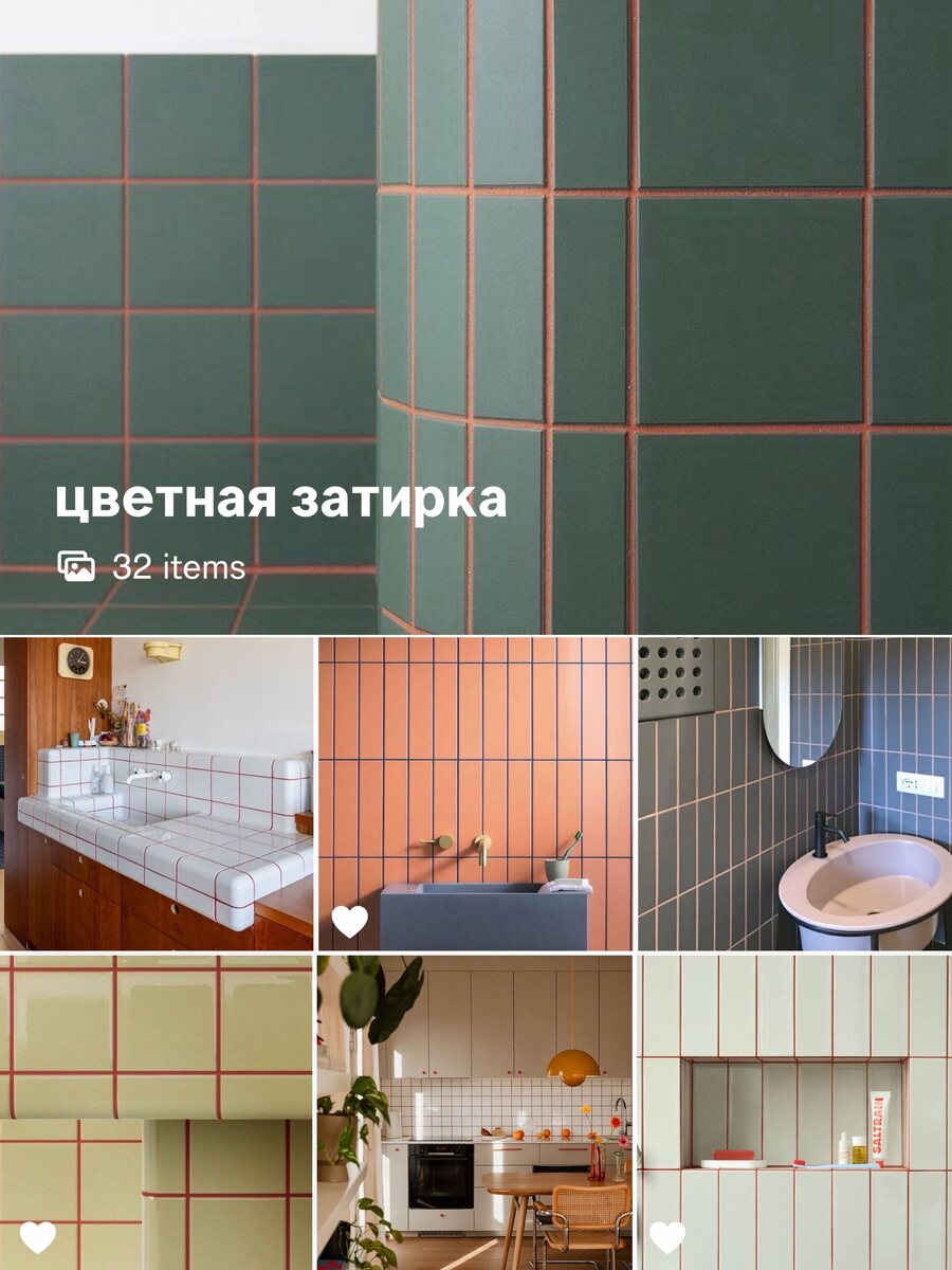 Цветная затирка превращая фон в рисунок: плитка перестаёт быть просто облицовкой и начинает работать как графика. Важно, что здесь играет роль не только цвет, но и контраст + толщина линии. Тёплая терракота с холодной зеленью, молочный фон с кирпично-красной сеткой, пыльно-розовый с графитовой разметкой: глаз читает это как ритм, а не как декор. Поэтому приём особенно хорош в ванных и кухнях: там, где плоскостей много, а лишние детали ни к чему 🧴