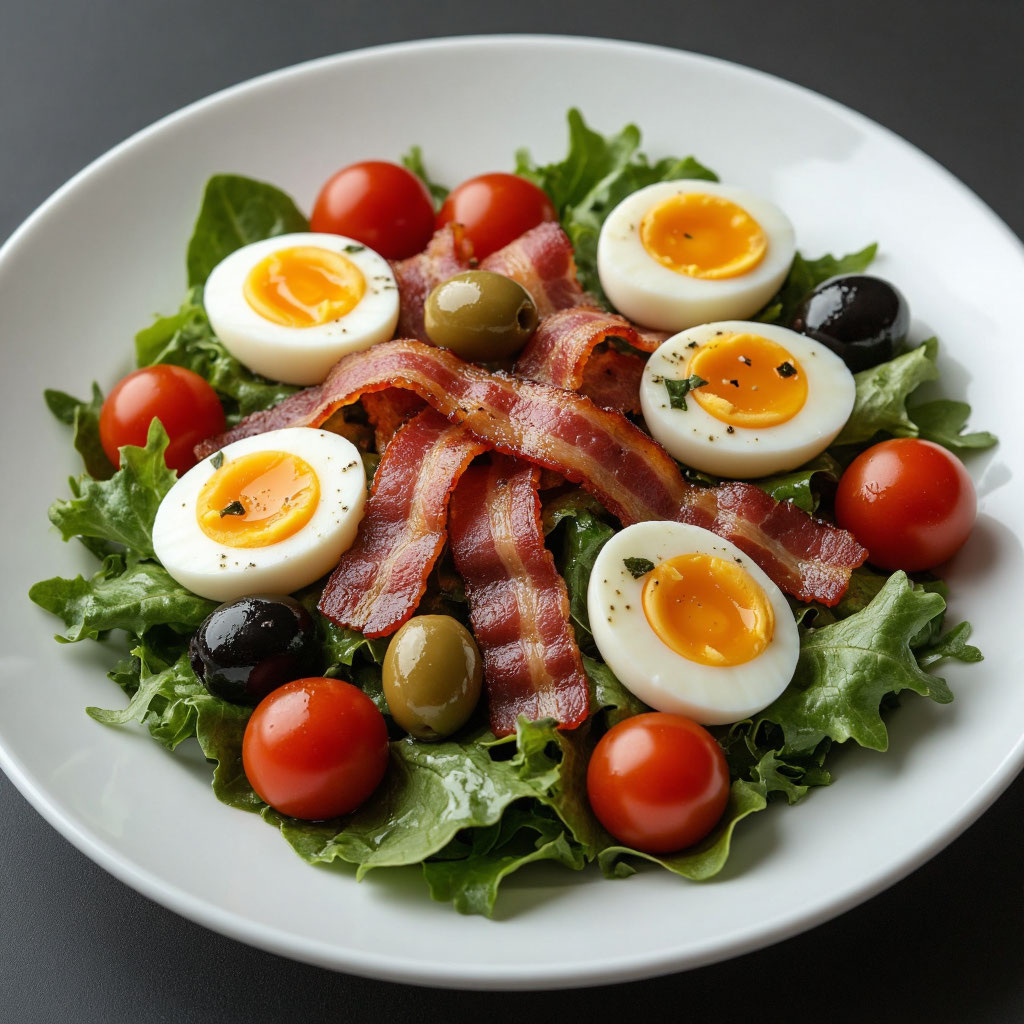 медово‑горчичную заправку (1 ч. л. мёда + 1 ч. л. дижонской горчицы + 2 ст. л. оливкового масла). - Подача: сервируйте салат сразу после приготовления, чтобы салатный микс не обрёл вялый вид, а бекон сохранил хруст.