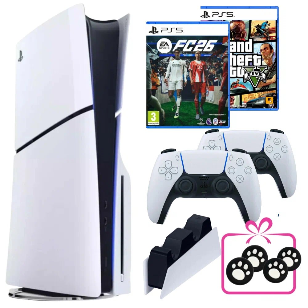 Комплект PS5 Slim с дисководом, вторым геймпадом, FIFA 26, GTA 5 и зарядной станцией — это баланс мощности, удобства и разнообразия. Он подойдёт: