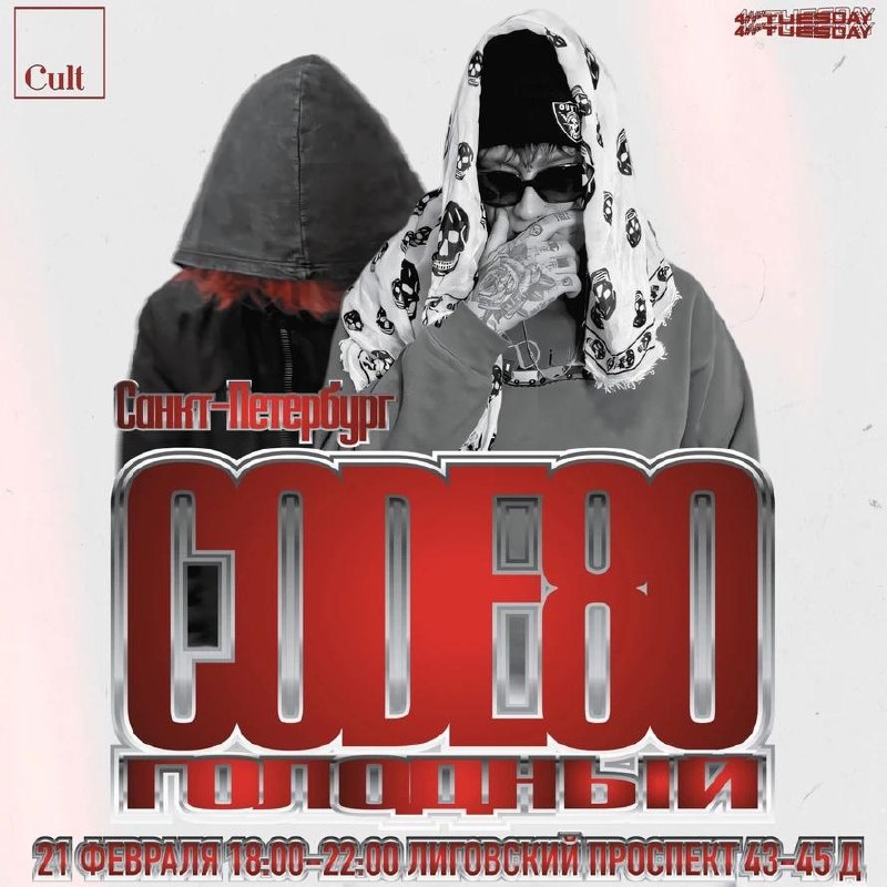 🎤 – CODE80, голодный 📍 – «CULT», Санкт-Петербург, Лиговский просп. д. 43-45Д 🗓 – 21 февраля 💵 – от 890 руб. 🔗 – билеты (16+) #концерты #билетынаконцерт #code80 #голодный #санктпетербург #cultspb 👉 Список концертов: январь • февраль • март @est_prohodka