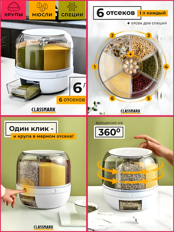 ✔️ В семье есть дети, которым можно доверить насыпать себе хлопья — это безопасно и аккуратно. Classmark 6-в-1 — это не просто контейнер. Это система, которая меняет подход к хранению. Это покупка не для продуктов, а для вашего удобства и времени. Classmark 6-в-1 — это одна из лучших идей на рынке. Если вы устали от кухонного хаоса и готовы инвестировать в его решение — эта «карусель» вас не разочарует. Она делает рутину — проще, а полку — красивее.