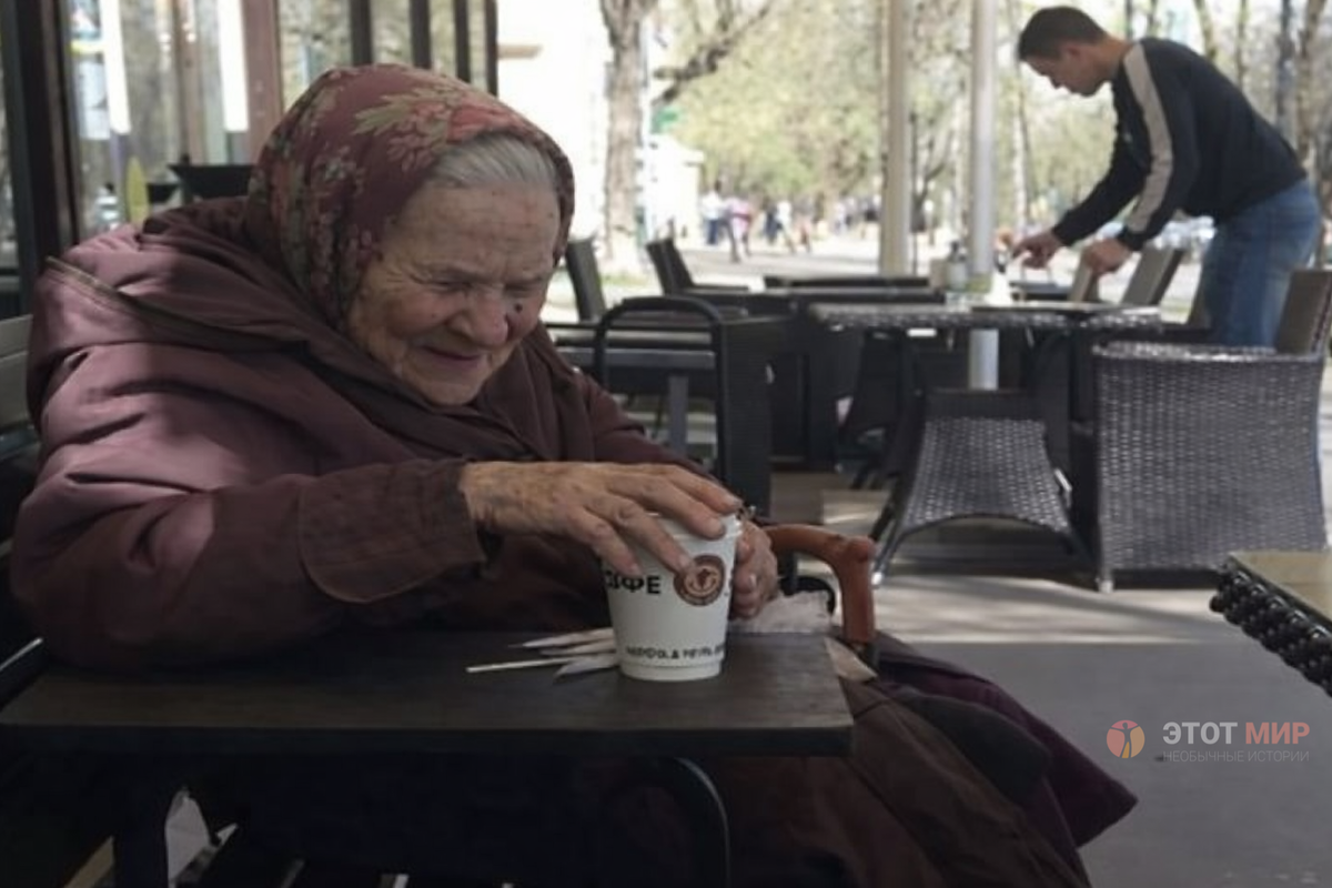 Новые посетители замечают её сразу. В этой сцене есть что-то кинематографичное. Пожилая женщина, пустой стул, нетронутый кофе. Она словно эпизод из другого времени. Тихая, неподвижная история посреди шумного мира.