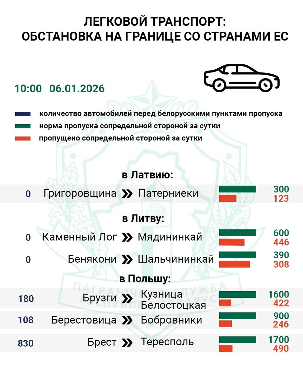 По состоянию на 10:00 очередь легкового транспорта на въезд в Евросоюз фиксируется перед всеми польскими пунктами пропуска. Об этом сообщили в Пограничном комитете Беларуси. Контролирующие службы «Тересполя» («Брест») за сутки оформили 28% легковушек. Въезда в Польшу через данный погранпереход ожидают 830 авто. Через пункт пропуска «Кузница Белостоцкая» («Брузги») проследовало 26% транспорта от нормы, а через «Бобровники» («Берестовица») — 27%. Здесь в очереди находятся 180 и 108 единиц легкового транспорта соответственно. Ситуация с автобусами на въезд в Польшу перед погранпереходом «Тересполь» («Брест») остаётся напряжённой: в очереди 81 транспортное средство.