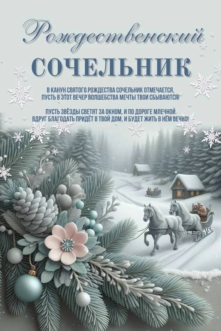 »! От всей души поздравляю вас с великим праздником — Рождественским сочельником! Пусть этот светлый день наполнит ваши сердца теплом, радостью и верой в чудеса. Желаю вам крепкого здоровья, семейного благополучия и изобилия всего самого доброго и прекрасного. Пусть каждый ваш день будет таким же светлым и радостным, как эта святая ночь перед рождением Спасителя мира. Пусть благодать Божия пребывает в ваших домах, на вашей земле и в сердцах близких вам людей. Мира вашему дому, счастья вашим семьям и процветания вашему делу! С Рождеством Христовым и Рождественским сочельником!