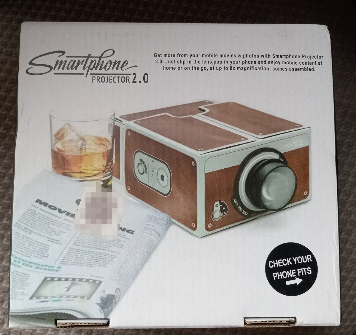 Большой смартфон не подойдёт, всё-таки ширина коробки ограничена. Пупырками внутри предназначена для удержания телефона, линза в обычной круглой кортонке.