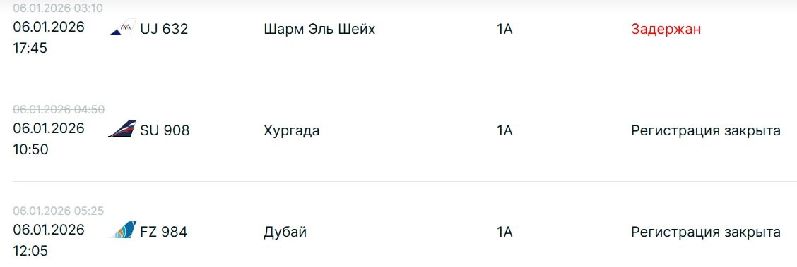 Три рейса, в том числе из Дубая и Хургады, ушли на запасные аэродромы. На вылет самое большое опоздание у N4 709 авиакомпании Nordwind, который должен был вылететь в Краснодар сегодня в 12:25, но отправится только завтра в 05:25. На прилет на 15 часов задерживается UJ 631 AlMasria из Шарм-эль-Шейха. Подробнее написали на ТурДоме. @tourdom