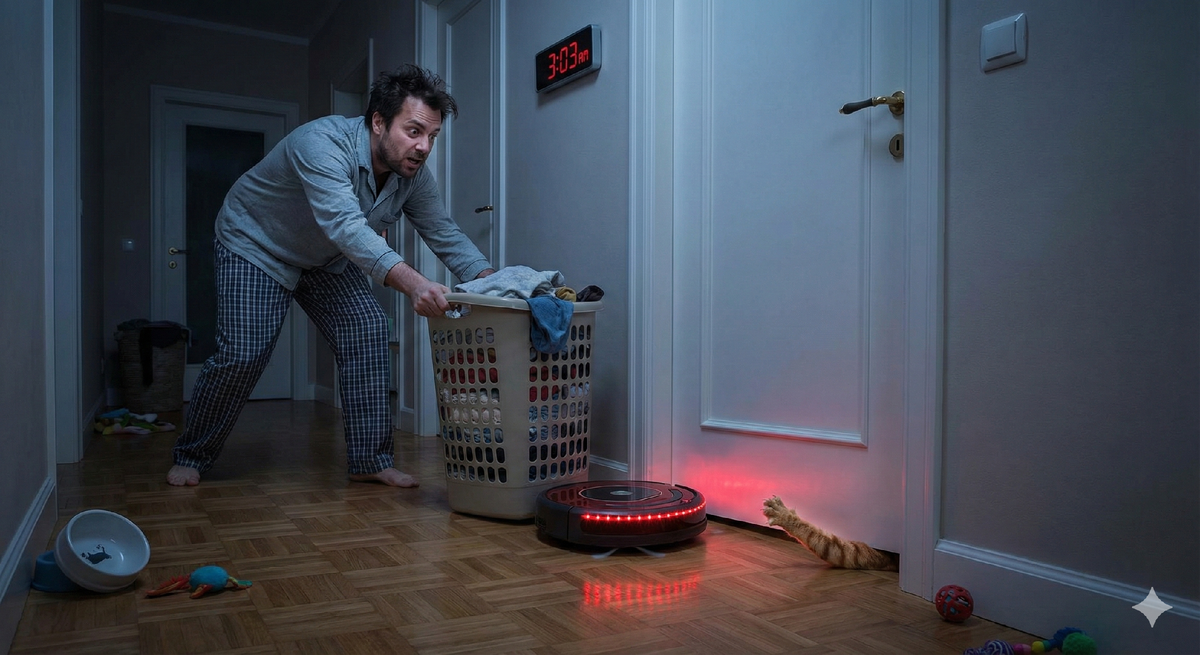 Спал я, граждане, сном праведника. Тишина в квартире, только холодильник интеллигентно урчит, да кот Барсик в ногах сопит. Идиллию нарушил резкий звук. Такое ощущение, будто в коридоре кто-то мебель двигает с целью перепланировки помещения. Глянул на часы - три ночи. Барсика на месте нет. Ушел, видимо, по своим неотложным делам в санитарную комнату. А шум не утихает. Жужжит что-то, тыкается. Это мой робот-пылесос, которого жена ласково зовет «Себастьян», решил проявить инициативу. У него, видите ли, по графику ночная зачистка территории. Искусственный интеллект не дремлет, он бдит за чистотой паркета. Выхожу в коридор. Картина маслом. Дверь в туалет закрыта. А под дверью этот круглый террорист буксует. И не просто буксует, а с остервенением толкает тяжелую корзину с бельем прямо на дверь. Забаррикадировал вход намертво. А из-за двери доносится такой вой, что у меня мурашки по спине марш-бросок устроили. Барсик там, внутри. Зашел, понимаете, по нужде, а выйти не может. Попал в капкан ци