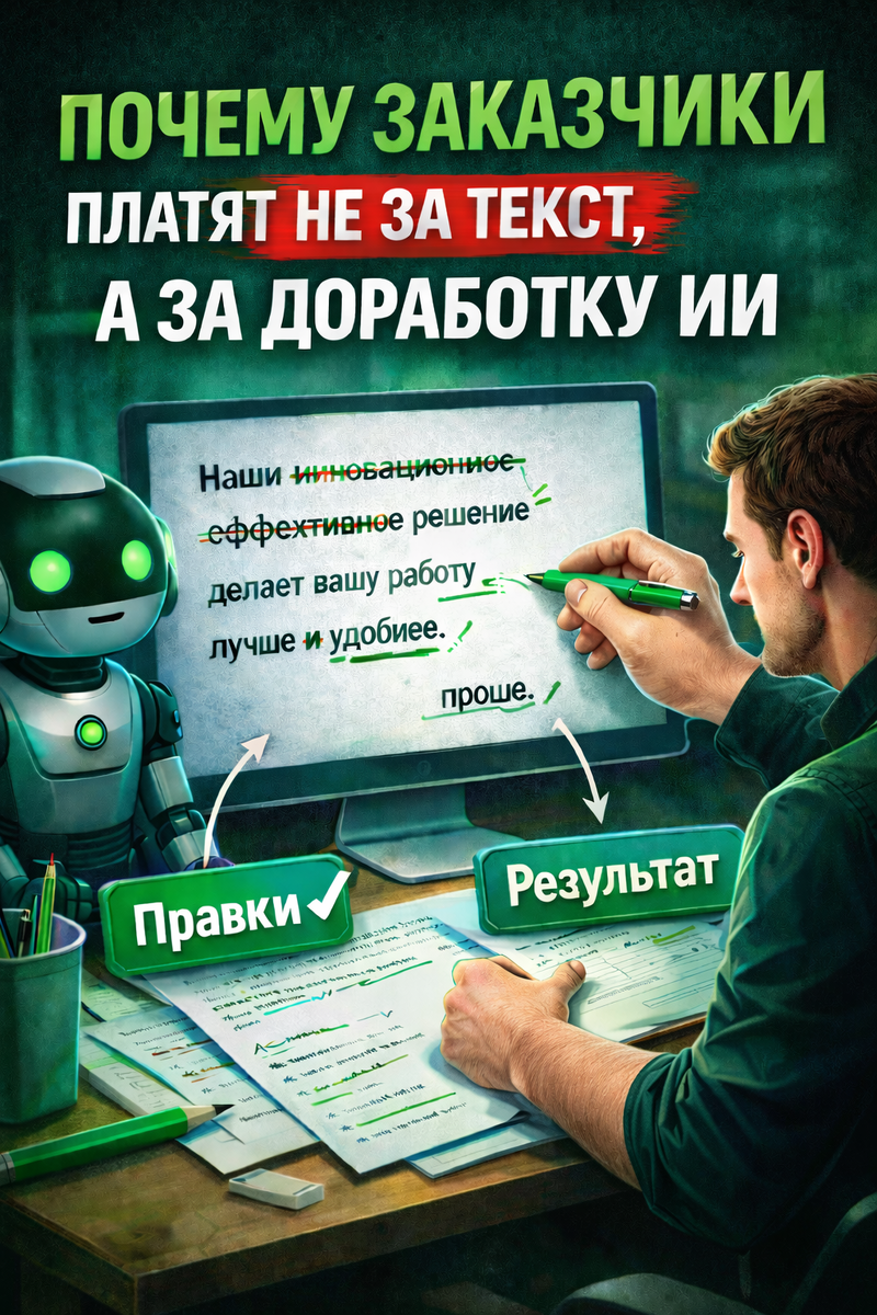 Не чувствует, где важно надавить, а где лучше промолчать. В итоге текст: И заказчик это видит. 🧠 За что на самом деле платят Заказчики платят за доработку, потому что она решает конкретные проблемы. Копирайтер: ИИ даёт основу.
