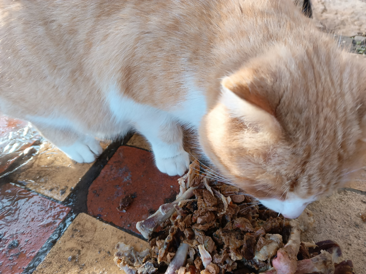 Всех с наступающим рождеством, позавчера я путешествовала на дачу ) Повезло и удалось накормить двух котеек, еды от Агаты осталось много. В предыдущий раз котейки не пришли, а пришли две большие собаки. Собак я боюсь. Было смешно - я сижу за сеткой (им меня не видно) - смотрю, бегут двое один за другим по дорожке. Я крикнула громко -брысь отсюда -они как по команде развернулись и по той же дорожке побежали назад один за другим ) В этот раз я услышала просящее мяуканье. Мяуканье было жалостливое, а сам котейка оказался совсем не жалким - толстый, рыжий и холеный. Я так и не разобралась, девочка или мальчик. Но судя по тому, что он устроил склоку с пришедшим позже черным котом, мальчик ) Драться не дрались, но орали друг на друга долго ) Сначала пришел жирненький рыжий и хорошо поел, уже не влазит. Видите, животик висит ) Когда он хорошо наелся, пришел знакомый черный Пришлось еду ему кинуть, потому что рыжий сел на то, что осталось и не подпускал черненького к еде. Потом они нач