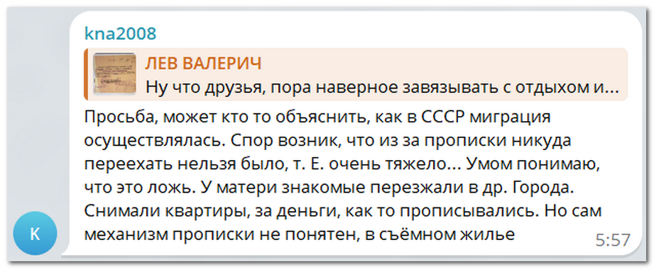 💬 ..."открою великую тайну, с советских времен мало что поменялось, разве что название, с прописки на регистрацию. Ах да, еще жилье людям сейчас никто бесплатно не дает"... --- Добрый день друзья! Сегодня в моем ТГ-канал один из читателей задал вопрос, как в СССР происходила внутренняя миграция? Как вообще люди могли переехать из одного места в другое, если все были крепко привязаны "пропиской"? На этот вопрос, я уверен, авторитетно может ответить любой человек, родившийся, выросший и создавший семью в СССР. Впрочем, открою великую тайну, с советских времен, по большому счету, мало что поменялось, разве что название, с прописки на регистрацию. А больше ничего, за исключением того, что жилье людям сейчас никто бесплатно не дает. Как было, на моем собственном примере. В свое время, после окончания ПТУ, оно располагалось в 17 километрах, райцентре, куда я ездил учиться из своей станицы, мне пришлось переехать в Ростов, т.к. я поступил в университет.