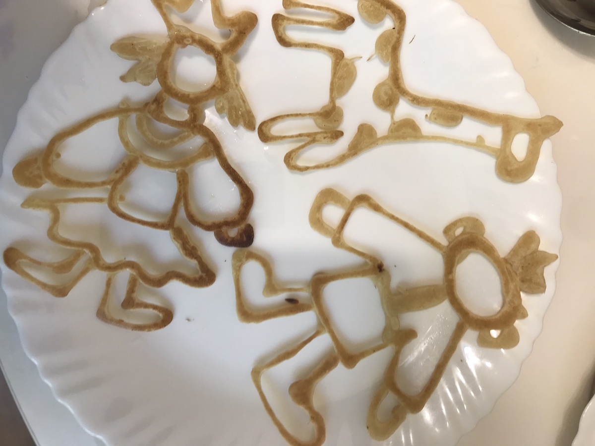 Тесто заводим, как на оладушки, набираем его в большой шприц с иглой и рисуем прямо на сковородке. Из плюсов: мучного съели поменьше и опять же творческий момент, можно даже придумать сказку. Это про Муху-Цокотуху))) Это просто свободное творчество. Можно дать рисунку пропечься, а потом налить теста, как на полноценный блин, рисунок и основная часть будут отличаться по цвету, тоже интересно. У нас сегодня пурга и ветер, отдыхаем от лыж, горок и ватрушек. А чем-то веселить младшее поколение надо. Чем не вариант)?