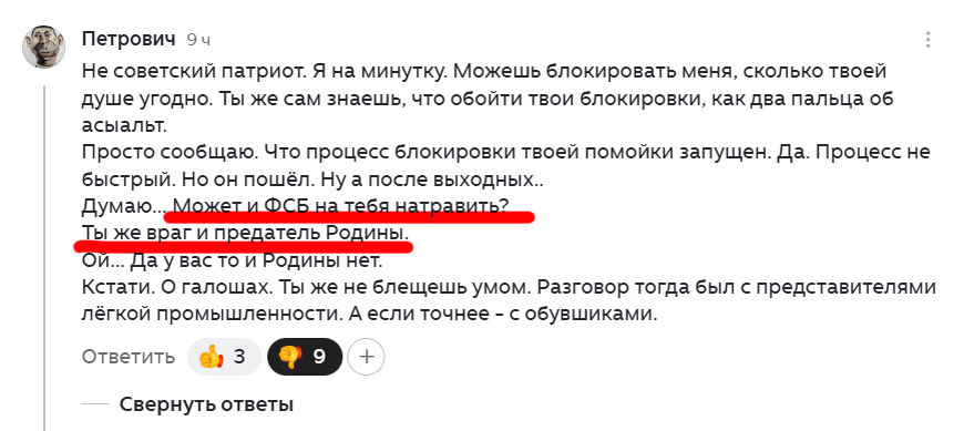 Сложно пройти мимо вот такого обвинения в адрес автора: Из комментария понятно, что персонаж с ником "Петрович" явно попутал любовь к начальству с любовью к Родине и теперь грозится прикрыть мой канал с помощью доносов. Один донос уже написал (в Спортлото, видимо), а после праздников напишет еще в ФСБ. Из чего можно сделать вывод, что перед нами явно какой-то вредитель, решивший перегрузить органы работой. Видимо, мало у них дел по поиску настоящих террористов, диверсантов, коррупционеров и прочих преступников, наносящих реальный вред государству. Пусть теперь займутся бессмысленным поиском крамолы в каком-то захудалом блоге. Что касается утверждения о "предательстве" Родины. Моя Родина -- это СССР, в котором я родился, вырос и стал взрослым человеком. Я даже воинскую присягу давал СССР. А потому, да, я патриот своей советской Родины и не собираюсь ей изменять, несмотря на то, что юридически СССР не существует. Ведь это всё равно, что предать память о своих родителях, дедушке с бабушко