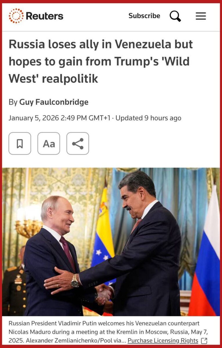 относительно российских планов по Украине, - Reuters В Кремле считают, что США, свергнув режим Мадуро, объявили Латинскую Америку своей зоной влияния. Эти действия США были восприняты как сигнал о том, что закулисные договоренности "сфера за сферу" возможны. Утверждается, что Россия предлагала подобную идею еще во время первого срока Трампа. Подпишись на Телеграм Александр Семченко