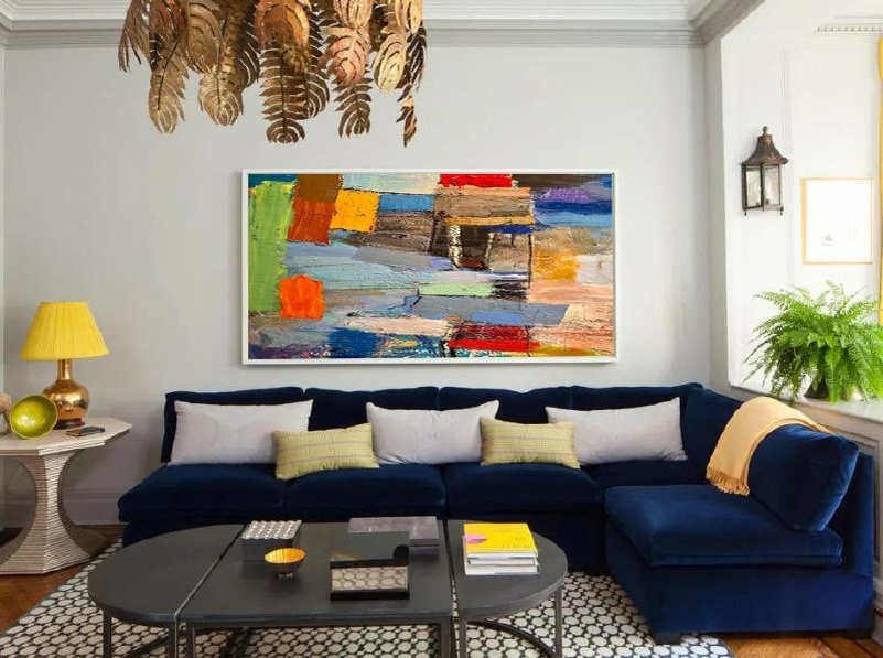 Акценты в интерьере: Яркая фактурная абстракция для акцентной стены в современном интерьер Этот динамичный акцент - абстракция с насыщенными цветами и мощной фактурой - делает интерьер живым и дизайнерским. Картина усиливает глубину синего дивана, добавляет энергии пространству и связывает в единое целое все акцентные элементы интерьера — текстиль, декор и свет. Такой арт идеально подходит для гостиной, где важно создать стильное и выразительное настроение. Больше примеров подбора картин к интерьеру: https://lcvr.net/IlSP
