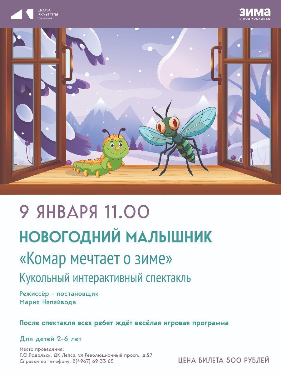 »! 💝Это история, полная чудес и доброты, созданная специально для самых маленьких сердец. 🌞В жаркий летний день комар знакомится с гусеницей. Гусеница рассказывает своему новому другу о временах года, о которых комар никогда не слышал, и особенно – о загадочной зиме. И вот, у комара рождается мечта – увидеть зиму ❄️ своими глазами... 🚫 Возраст: 3+ 📆 09.01.2026 🕒 11:00 🏢 Дом культуры им. Лепсе 📍 г. Подольск, Революционный просп., 27 💰 Цена: 500 ₽ 🎫 Купить билет: https://www.afisha.ru/w/session/123848487/706d0e75-fed6-4a40-aa7a-0e57ea05ec32/https #спектакльПодольск ⭐Поддержать канал голосом 🍰Где поесть в Подольске ✅ Мероприятия Подольск https://dzen.ru/id/66ed500f7b5671493eca3fd6 http://vk.com/podolsk_events http://dzen.ru/podolsk_events