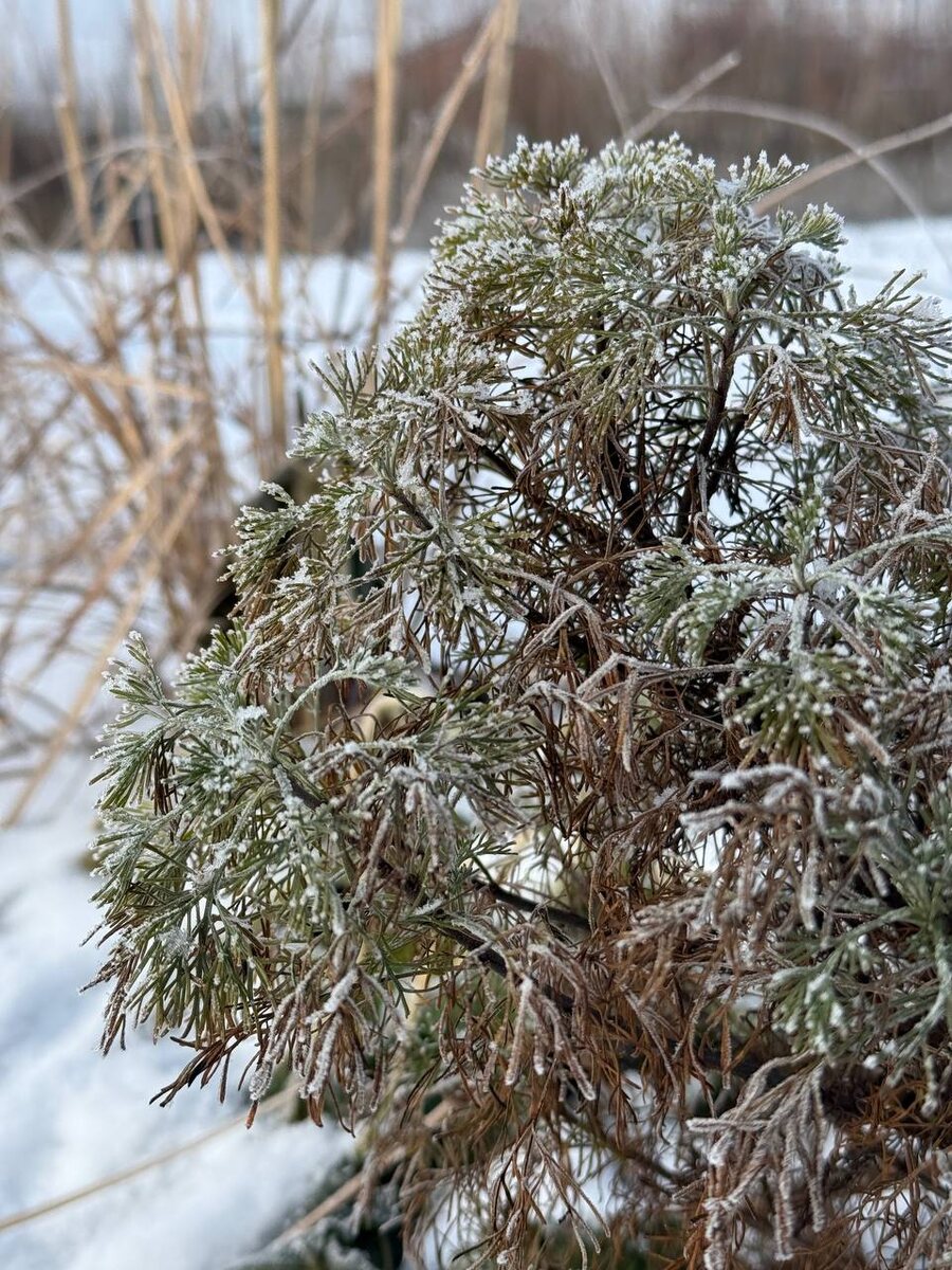 Без яркого цветения на первый план выходят форма, фактура и силуэт, и именно в это время многие из них показывают свой настоящий характер. Представляем вашему вниманию ПОЛЫНЬ КОЛА. Её резные листья напоминают морозные узоры на окне — тонкие, ажурные, с холодным серебристым оттенком. Листья постепенно увядают, но не полностью: полынь — полукустарник, отлично поддающийся стрижке. Сформированный летом плотный шарик зимой преображается и становится выразительным акцентом сада.