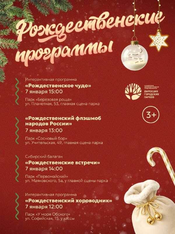 «Рождественский хороводник» (3+) устроят в 12.00 в парке «У моря Обского». Новосибирцев ждут пять станций-символов с танцами, поделками и играми. Все символы соберут в большой финальный хоровод с красочными хлопушками. В 13:00 в ДК «Приморский» на улице Молодости, 15 пройдет рождественская программа «Большой сюрприз для…» (0+). А в парке «Березовая роща» в 15.00 пройдет квест «Рождественское чудо» (3+). Юным героям предстоит пройти станции, выполнить задания и собрать пять элементов, чтобы волшебство вернулось.
