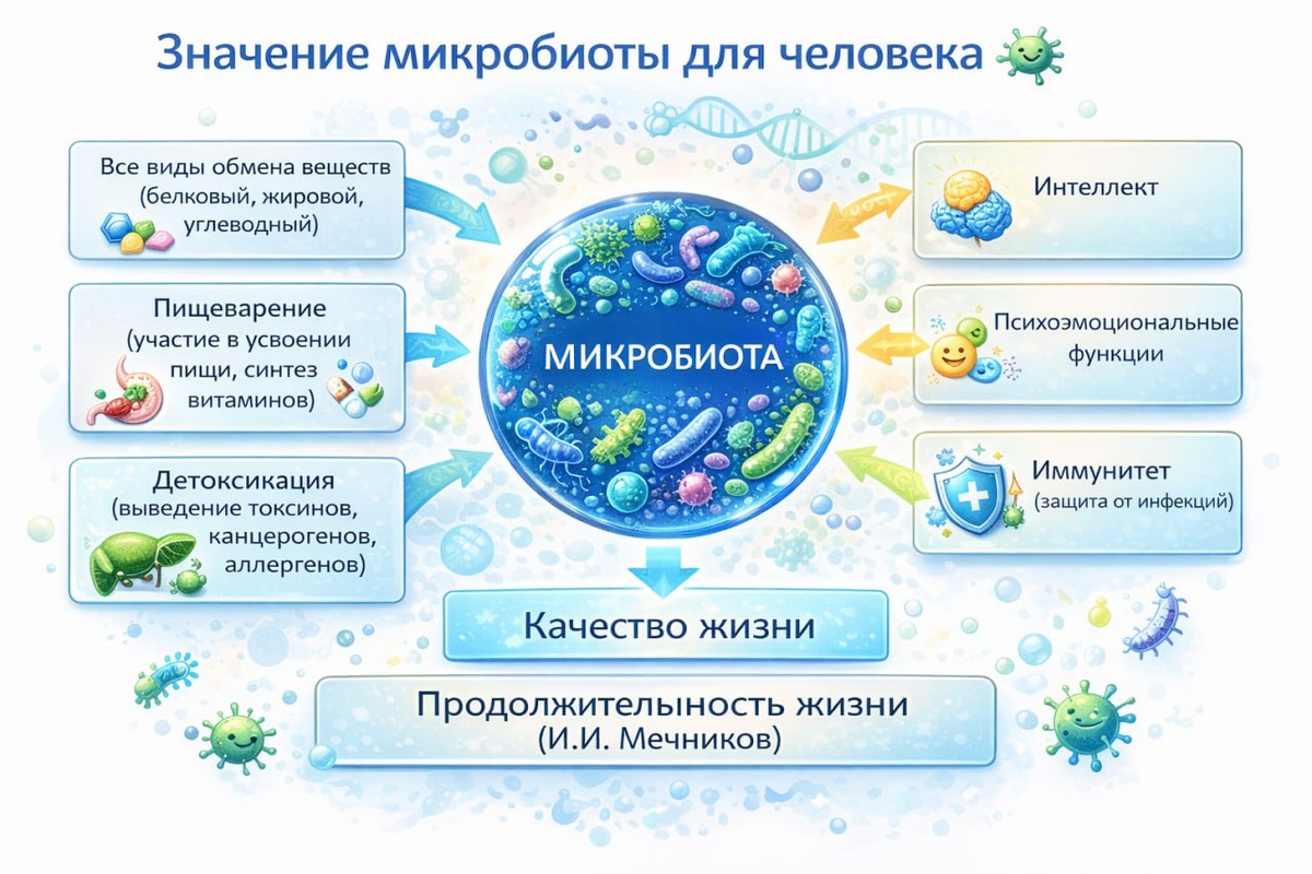 🦠 Микробиота — это не просто «бактерии в кишечнике». Это целая экосистема, от которой напрямую зависят наше здоровье, самочувствие и даже продолжительность жизни. 🔹 Обмен веществ Микробиота участвует во всех видах обмена: белковом, жировом и углеводном. От её состояния зависит, как организм усваивает питательные вещества и поддерживает энергетический баланс. 🔹 Пищеварение и витамины Полезные бактерии помогают переваривать пищу, улучшать усвоение микроэлементов и синтезировать важные витамины. 🔹 Детоксикация Микробиота участвует в выведении токсинов, канцерогенов и аллергенов, снижая нагрузку на печень и иммунную систему. 🔹 Иммунитет До 70% иммунитета связано с кишечником. Здоровая микробиота — это защита от инфекций и хронических воспалений. 🔹 Психоэмоциональное состояние и интеллект Кишечник и мозг тесно связаны. Состояние микробиоты влияет на настроение, стрессоустойчивость, концентрацию и когнитивные функции. ✨ Итог Здоровая микробиота = высокое качество жизни и, как считал И.