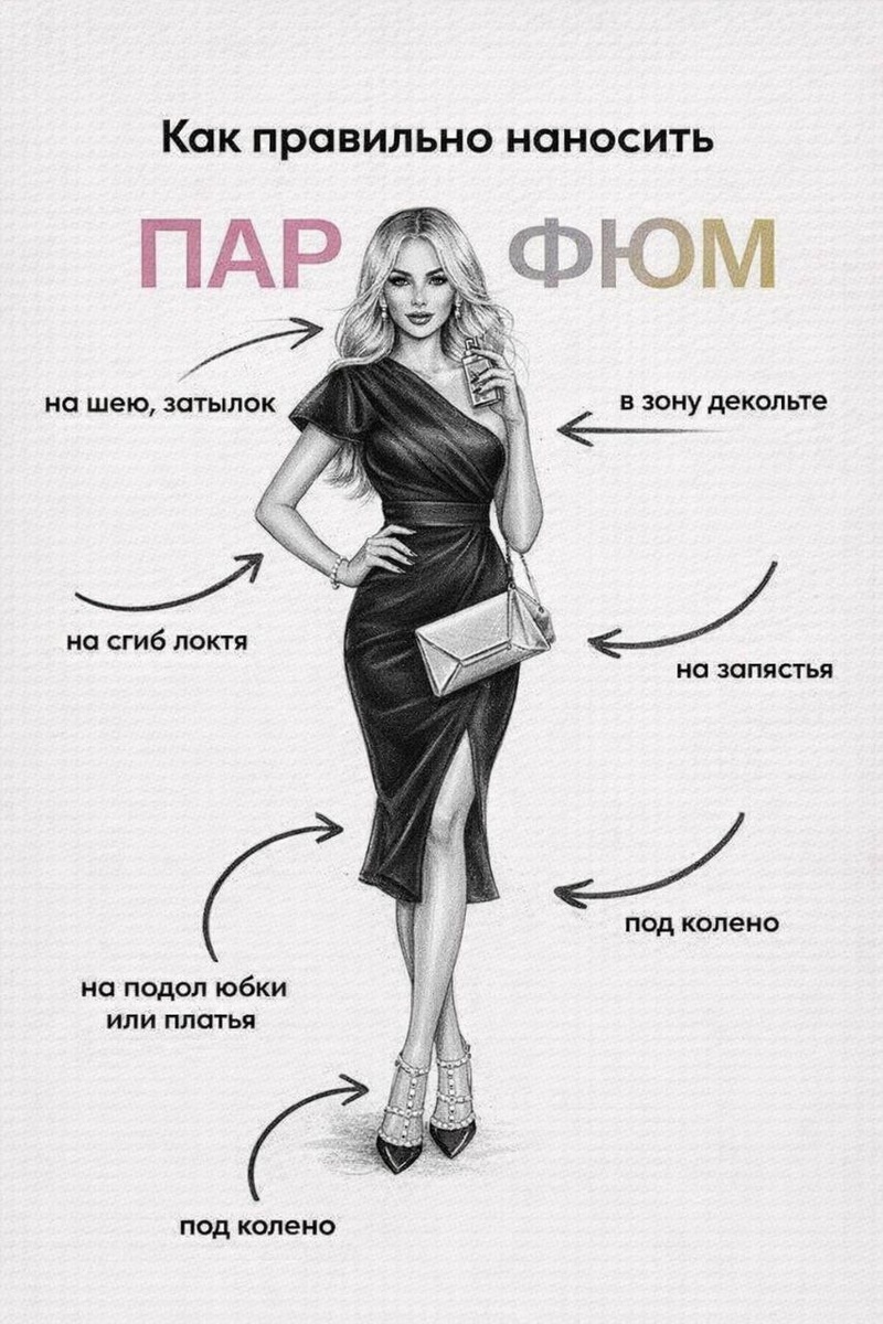 Парфюм — это ваш уникальный акцент, который может выразить атмосферу, настроение и даже создать впечатление.Как правильно применять ароматы, чтобы они звучали по-настоящему волшебно? Каждый участок тела открывает перед нами свою историю аромата. 💎Шея и затылок Эти зоны дарят истинную близость и нежность. Аромат здесь слышен при сближении, обеспечивая «шлейф памяти», остающийся с нами
