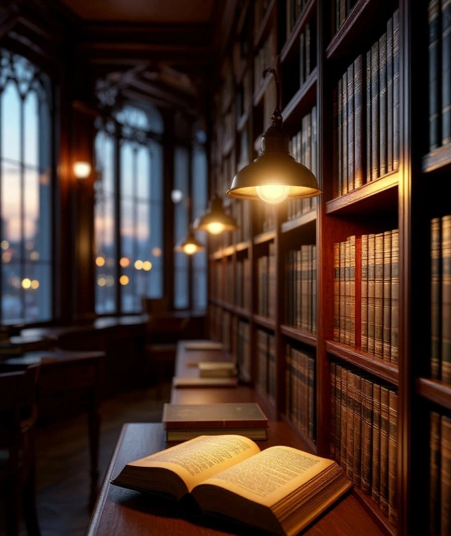 Вечер опустился на город, и мягкий свет лампы нежно обвивал полки библиотеки, где стояли ряды книг — хранительниц историй и тайн.