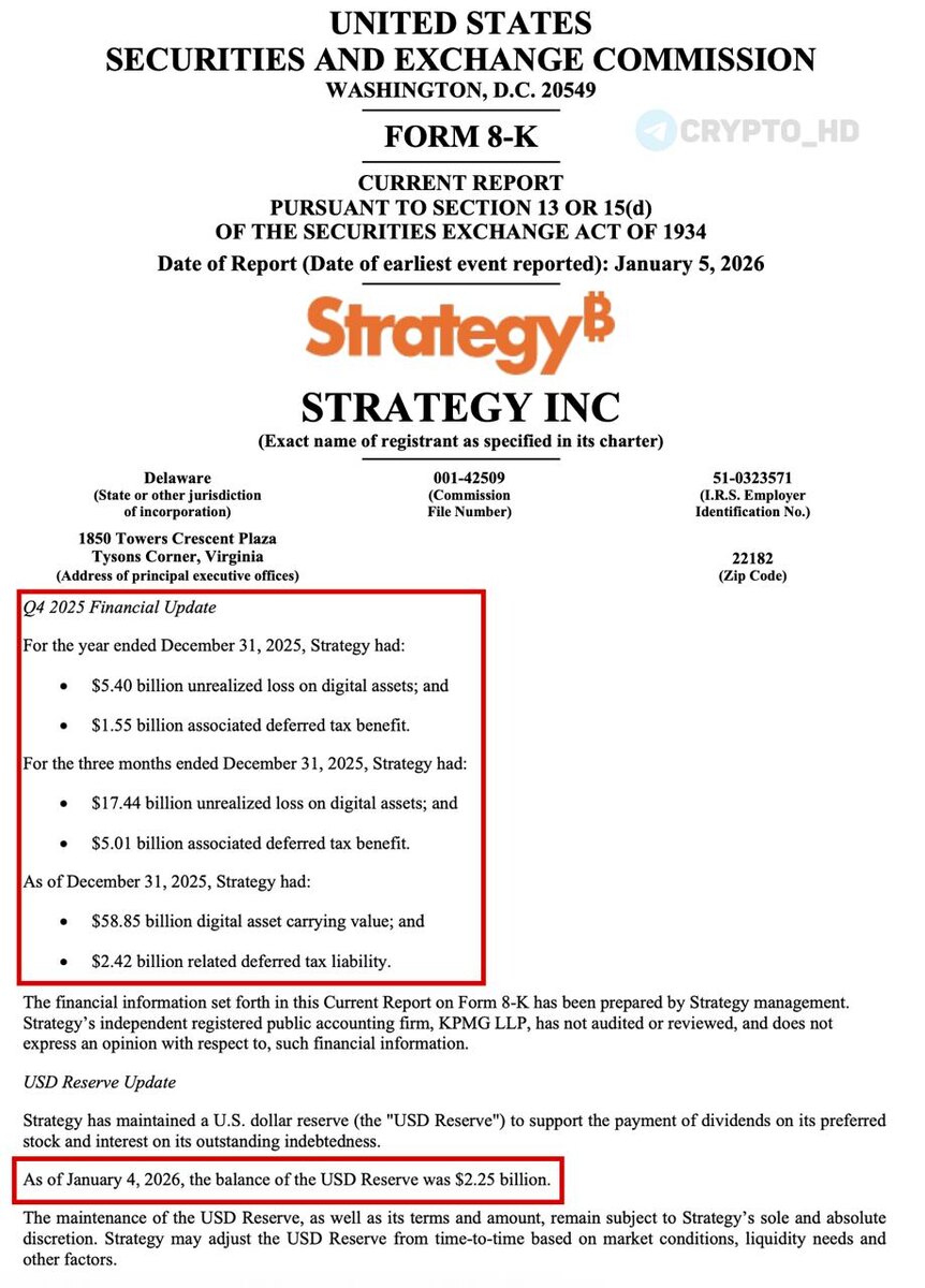 🔽 Strategy: Нереализованный убыток компании по BTC – $17,44b за 4 квартал 2025 года
