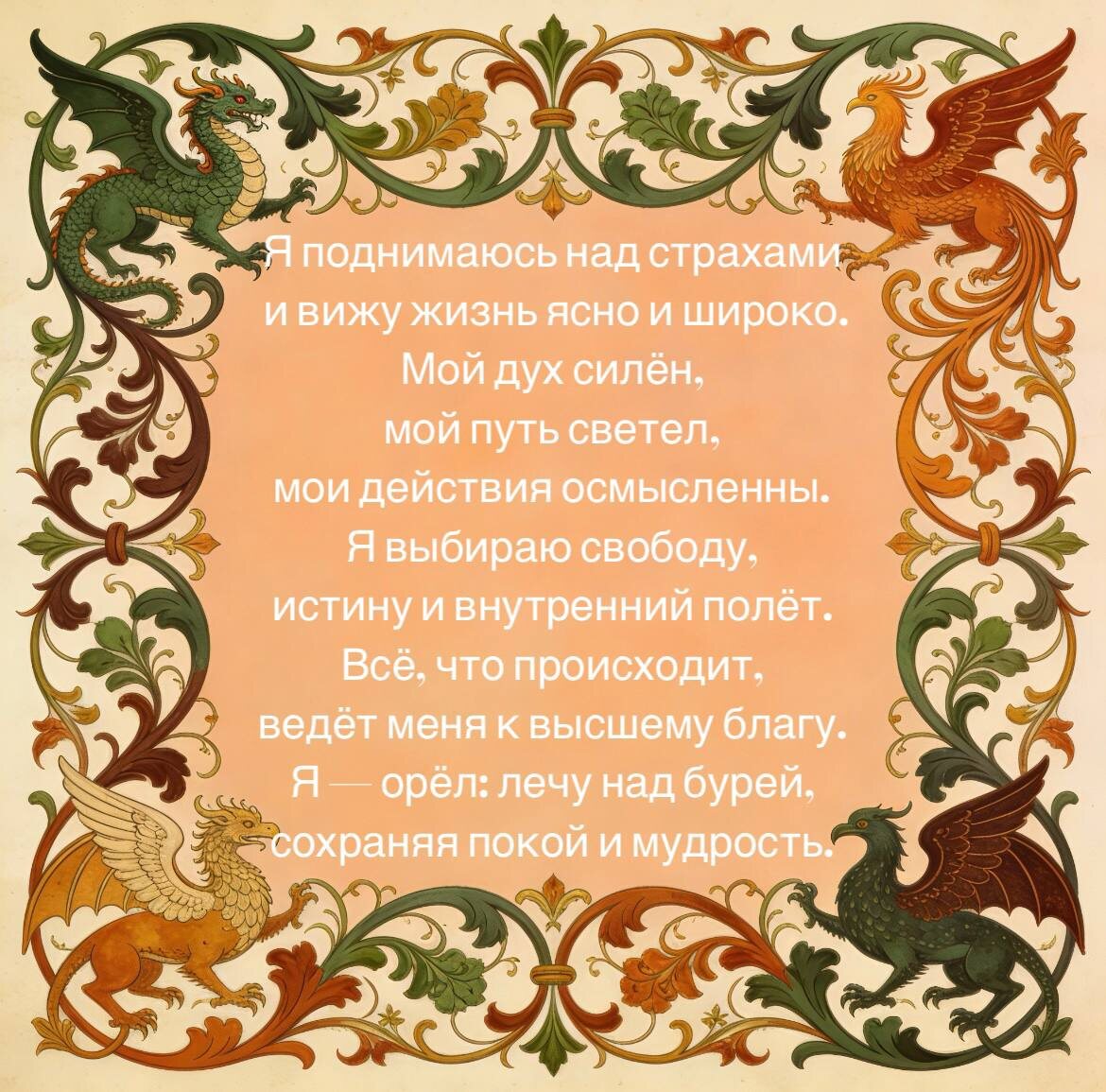 Это день, когда душа может подняться над суетой и увидеть свою жизнь с высоты: день духовной силы, осознания, преодоления и свободы. Символ Орёл олицетворяет мудрость над эмоциями. После напряжённого 19‑го дня приходит энергия ясности и внутренней мощи. Если действовать благородно, концентрированно и с верой в свою миссию, любые дела сегодня идут особенно успешно. Дыхание Орла Встаньте прямо, руки в стороны — глубокий вдох через нос. На выдохе поднимите руки вверх, представляя взлёт над суетой. Повторите 7 раз. Медитация «Поход к вершине» Закройте глаза, представьте гору. С каждым вдохом — подъём, с выдохом — освобождение от тяжести. На вершине — свет и ясность.