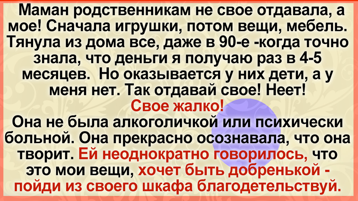 О, прям с моей мама списано! Только она не свое отдавала, а мое, с самого моего детства. Игрушки, потом вещи, мебель. Тянула из дома все, даже в 90-е -когда точно знала, что деньги я получаю раз в 4-5 месяцев (техничкой в школе работала).