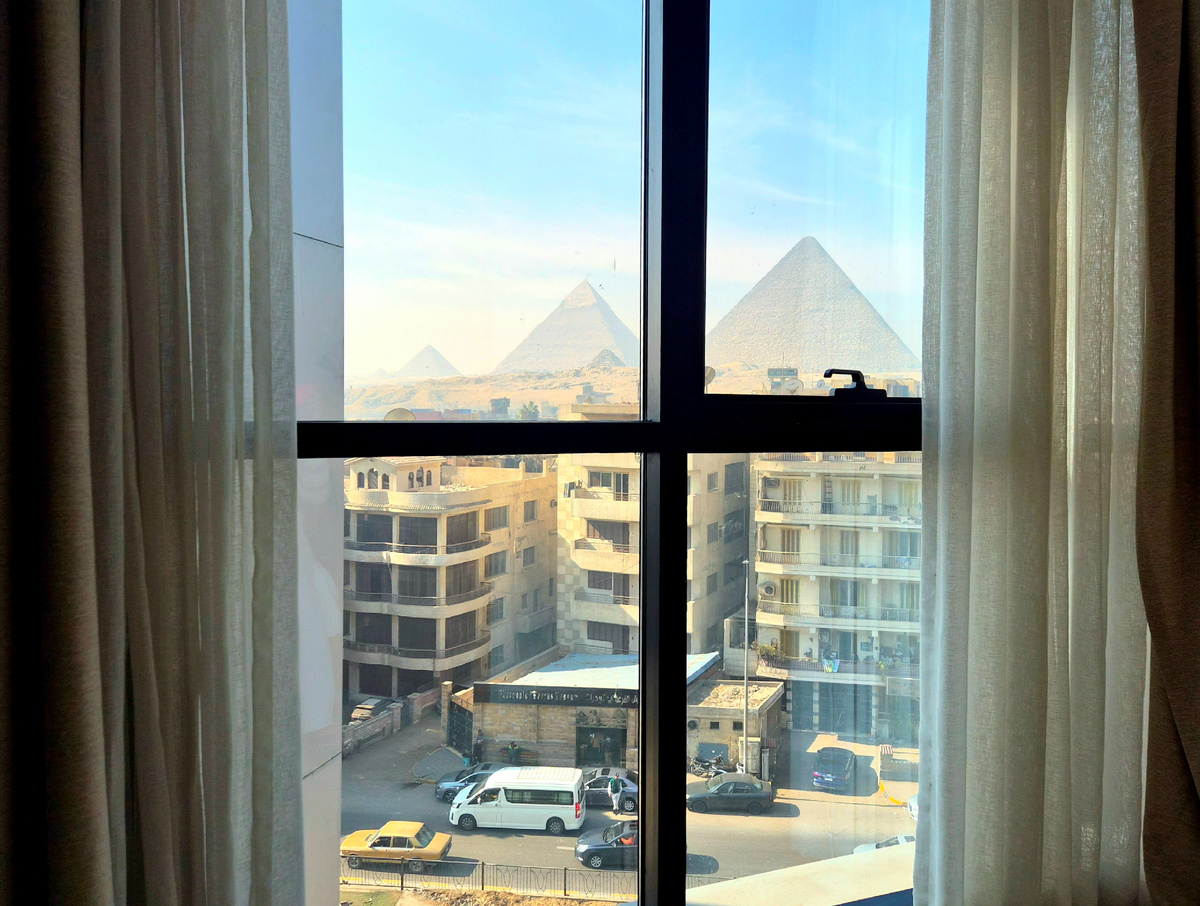 Пирамиды и сфинкс, а теперь ещё и Большой Египетский музей, находятся в Гизе — это отдаленный район Каира (а может, уже и пригород, я не уверена). Немудрено, что эта самая Гиза напичкана отелями, главное и основное достоинство которых — pyramids view, то бишь вид на пирамиды. Есть среди них дорогущие и пижонские, прежде всего знаменитый Marriott Mena House, есть совсем простенькие гестхаусы чуть ли не по 20 долларов за ночь, расположенные на верхних этажах жилых домов. Мы выбрали золотую середину — Neom Pyramids Valley. То самое, что принято иронично называть египетские пять звезд (которые похожи на три европейские). Ладно, на самом деле — без нареканий, вполне достойный отель.