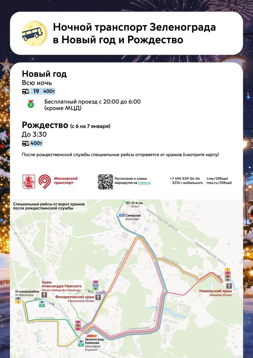 Напомним, как сегодня, в Рождественскую ночь, будет работать общественный транспорт в Зеленограде. Подробности — в инфографике.