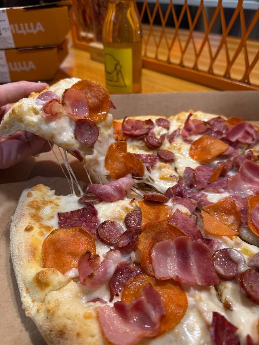 ?🤗 Чтобы режим отдыха был еще комфортнее, побалуйте себя вкусной пиццей. Например, нашей обновленной Мясной. Теперь это 5 видов мяса: 🍕 Цыплёнок 🍕 Говядина 🍕 Колбаски 🍕 Пепперони 🍕 Бекон. И все это под новым фирменным соусом😍 Ещё мяснее и ещё сочнее🔥 Уже пробовали? Как вам новый вкус?😌