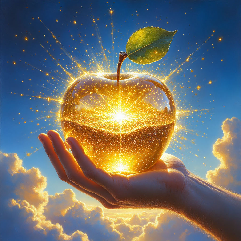 И на самом высоком дереве, в чаше, сотканной из лучей, росло Яблоко. Оно было совершенно прозрачным, и внутри него, словно в песочных часах, медленно перетекал золотистый Песок Времени. Пока песок тек ровно, мир пребывал в гармонии: день сменялся ночью, реки текли к океану, семена прорастали, а живые существа проходили свой путь от рассвета к закату.
