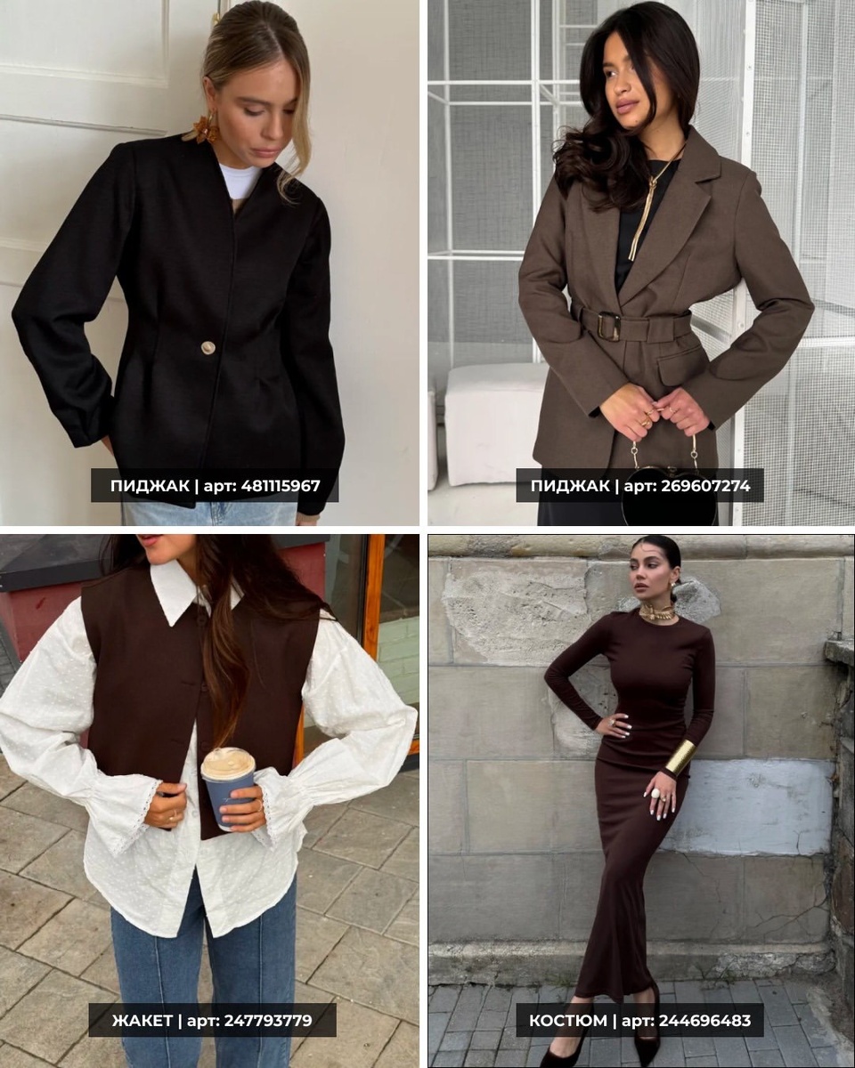Эта подборка — про «взрослую» женственность: ровные плечи, подчёркнутая талия, длинные линии, благородные оттенки шоколада и чёрного. Здесь нет случайных вещей — каждая позиция работает как инструмент: одна делает силуэт острее, другая добавляет мягкости, третья собирает образ в единое «дорогое» впечатление. И самое приятное: вещи легко миксовать между собой — достаточно менять обувь, ремень и украшения, чтобы получались новые сценарии.