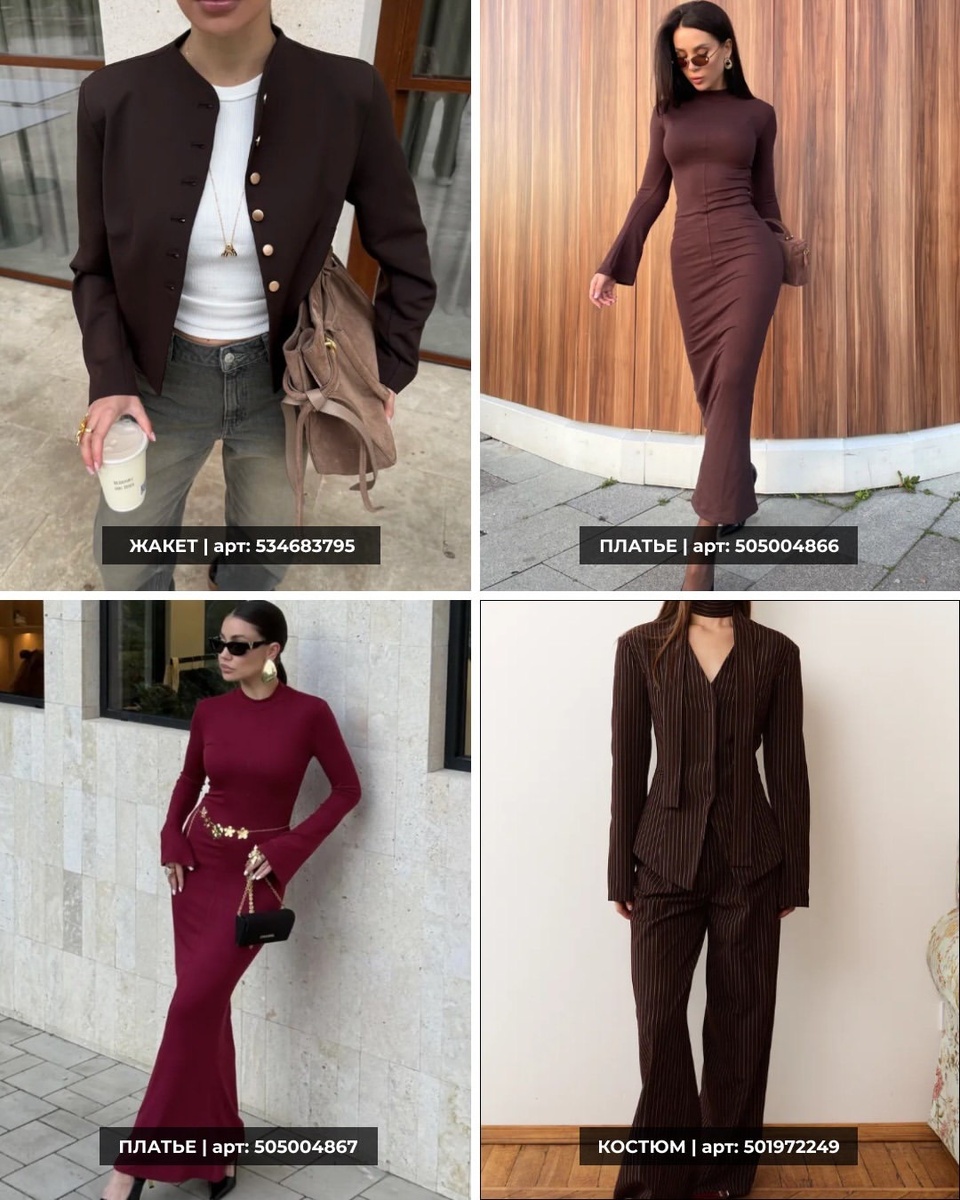 - Шоколад и вино для эффектных выходов: платья 505004866 и 505004867, жакеты 481117416 и 716342965.