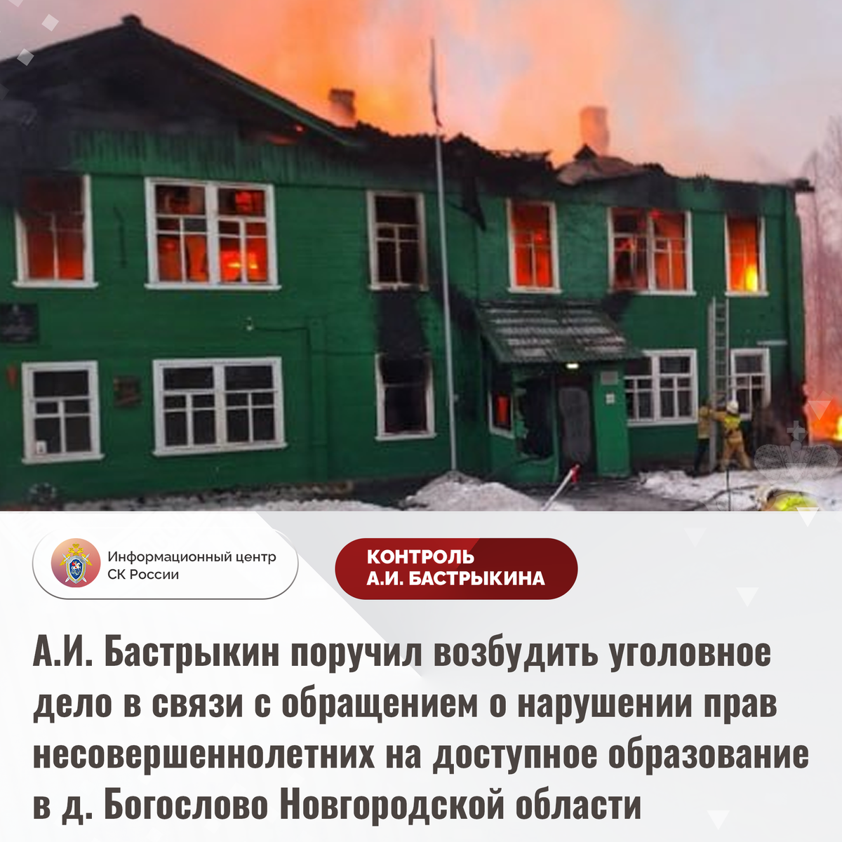 А.И. Бастрыкин поручил возбудить уголовное дело в связи с обращением о нарушении прав несовершеннолетних на доступное образование в д. Богослово Новгородской области В приёмную Председателя СК России А.И. Бастрыкина в социальной сети «ВКонтакте» поступило обращение по вопросу нарушения прав несовершеннолетних на доступное образование в деревне Богослово Пестовского района Новгородской области. В январе текущего года в здании единственной в населенном пункте действующей школы произошел пожар, в результате которого строение было уничтожено. Вместо организации дистанционного обучения и реставрации второй имеющейся в деревне школы учеников перевели в школу-интернат, расположенную в значительном удалении от мест их жительства. В случае отказа родителям предложено самостоятельно ежедневно доставлять детей в образовательное учреждение. При этом маршрут школьного автобуса не организован. Обращения в различные инстанции результатов не принесли, мер к разрешению ситуации не принимается. Указанн