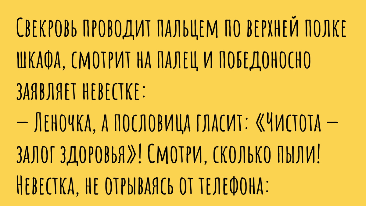 Вот это я понимаю — ответный удар! Шах и мат одной фразой. Свекрови почему-то обожают этот ритуал — поиск пыли в самых труднодоступных местах. Они лезут на антресоли, заглядывают под диван, проверяют плинтуса за шкафом. Такое ощущение, что они работают внештатными инспекторами СЭС. Им невдомек, что перед праздником Вы и так драили квартиру два дня. Но нет, она найдет ту самую единственную пылинку, которая предательски осела пять минут назад, и раздует из этого трагедию масштаба экологической катастрофы. А невестке из анекдота — медаль за смелость и находчивость!
