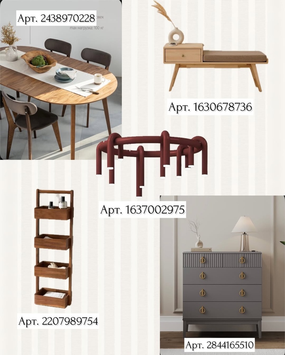 Эта подборка — про интерьер, который выглядит «дорого» не ценником, а ощущением: натуральное дерево, округлые формы, рифлёные фасады, плетёные вставки, спокойные бежевые базы и один-два смелых акцента. Здесь есть всё, чтобы собрать пространство цельно: обеденная зона, хранение, мягкая группа, декоративный свет и детали, которые делают дом живым.